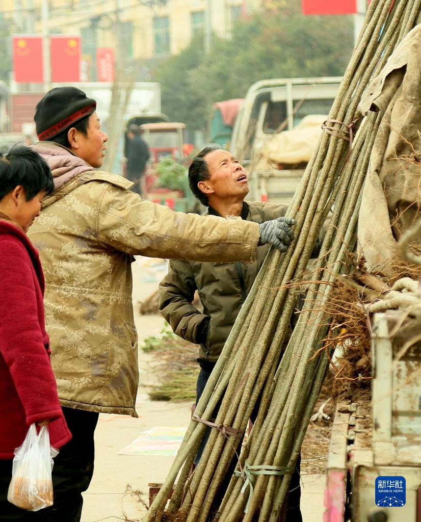 2月23日,在河南省洛陽市汝陽縣小店鎮集市上,農民精心選購樹苗。
