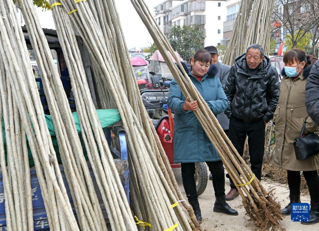 2月22日,安徽省淮南市壽縣堰口鎮(zhèn)江黃村村民在鄉(xiāng)村集市上選購(gòu)樹木。