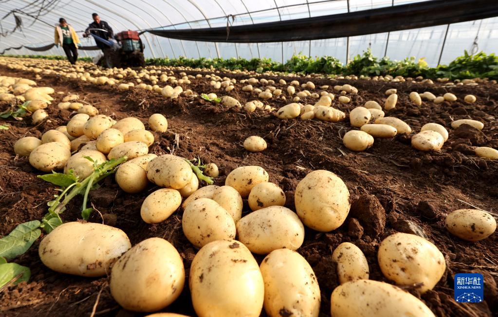 2月23日,在山東省棗莊市嶧城區(qū)古邵鎮(zhèn)梅花臺村大棚,農民使用機械設備收獲早春“訂單”土豆。