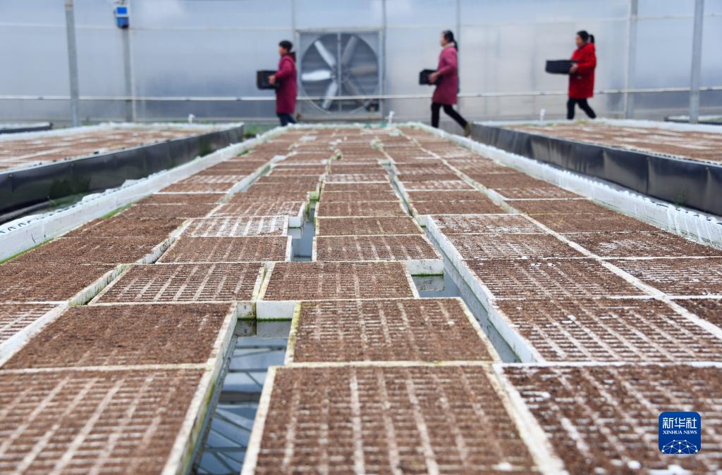 2月23日,在湖北省恩施土家族苗族自治州宣恩縣椒園鎮一處蔬菜專業合作社的智能溫控大棚,農戶在搬運育苗盤。