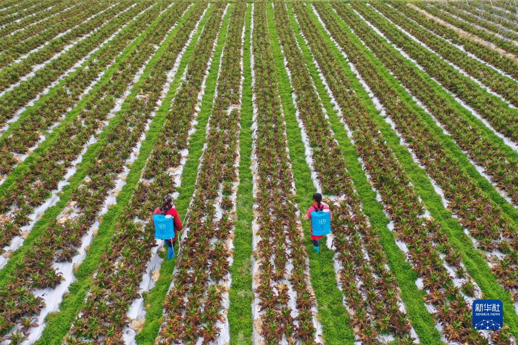 2月22日,在江西省吉安市泰和縣塘洲鎮洲頭村蔬菜種植基地,農民給蔬菜噴灑生物農藥,進行防病滅蟲管護(無人機照片)。