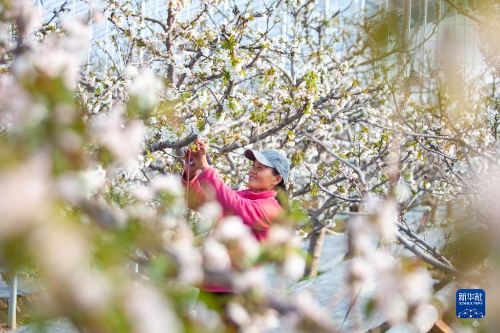 2月23日,山東省淄博市高青縣蘆湖街道大蘆家村農民在大棚里為櫻桃花授粉。