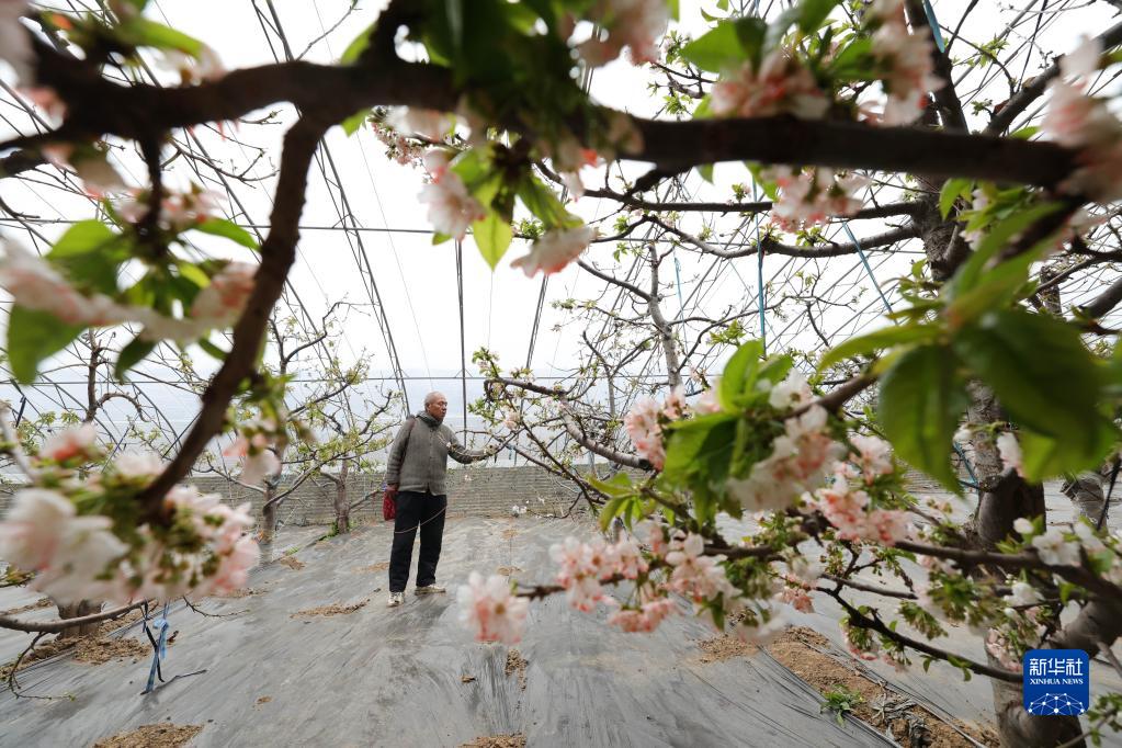 2月24日,河北省邢臺市內丘縣金店鎮小辛旺村果農在大棚里為櫻桃花人工授粉。