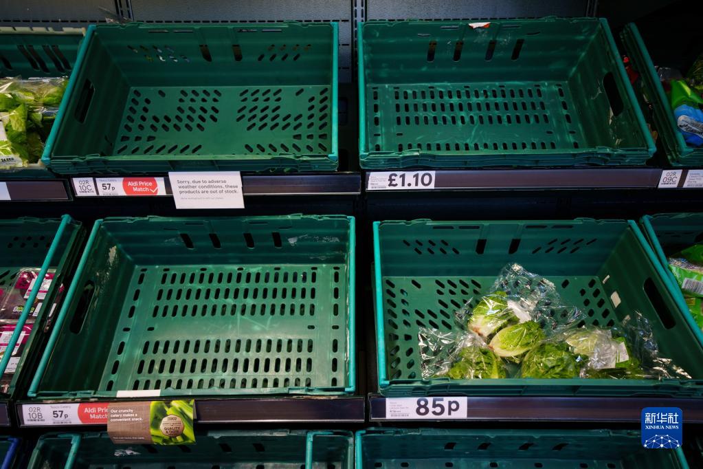 2月23日,在英國曼徹斯特,一家超市的蔬菜貨架出現缺貨。