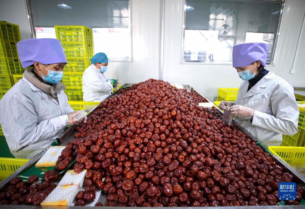 寧夏同心縣一家圓棗深加工企業(yè)內(nèi),工人對烘干后的圓棗進(jìn)行分揀包裝(2月23日攝)。