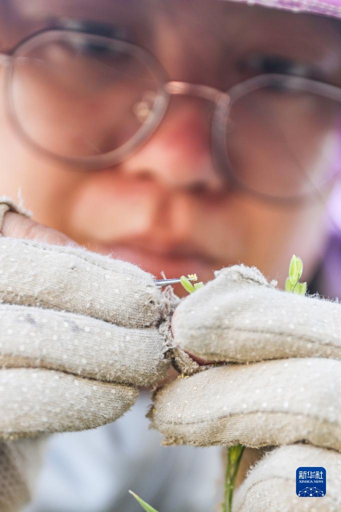 2月22日,青島海水稻研究發展中心的科研人員于萌在三亞的國家南繁科研育種基地里做水稻雜交實驗。