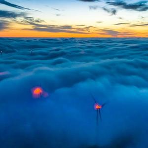 一場(chǎng)春雪過后,湖北省宜昌市秭歸縣云臺(tái)荒風(fēng)力發(fā)電場(chǎng)銀裝素裹,風(fēng)電機(jī)組在云海中旋轉(zhuǎn),美景如畫。