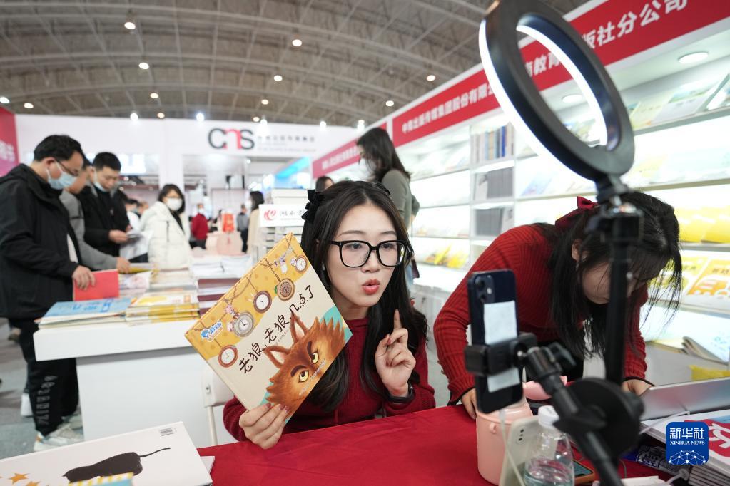 2月24日,在第35屆北京圖書訂貨會上,一名參展商工作人員在訂貨會現場直播,通過互聯網介紹書籍。