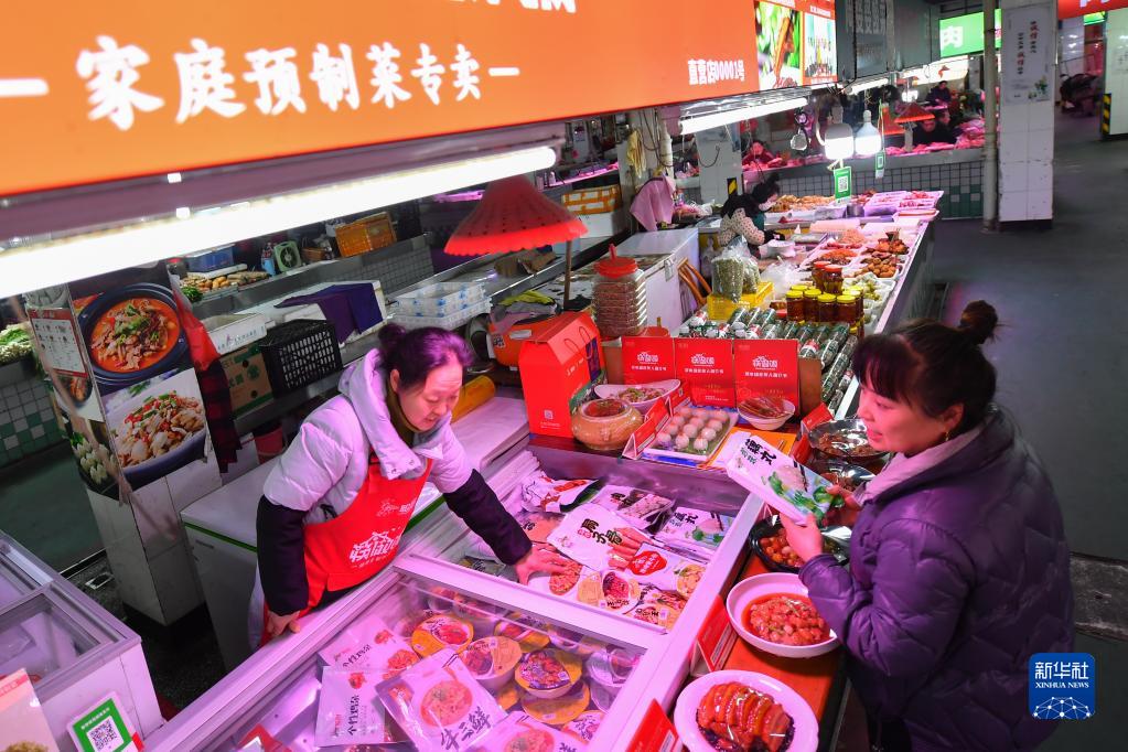 2月24日,消費者(右)在瀏陽市圭齋路生鮮市場挑選預制菜。