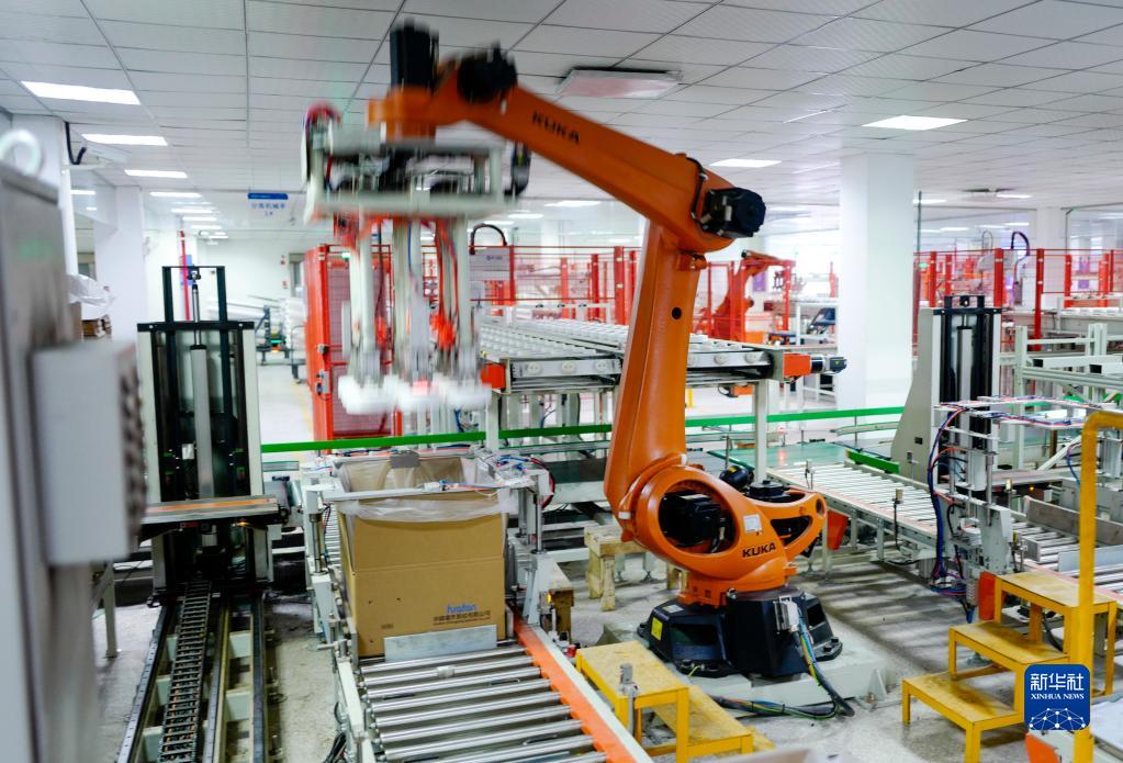 2月21日,重慶涪陵區(qū)白濤新材料科技城華峰重慶氨綸有限公司包裝車間內(nèi)的工業(yè)機(jī)器人在作業(yè)。