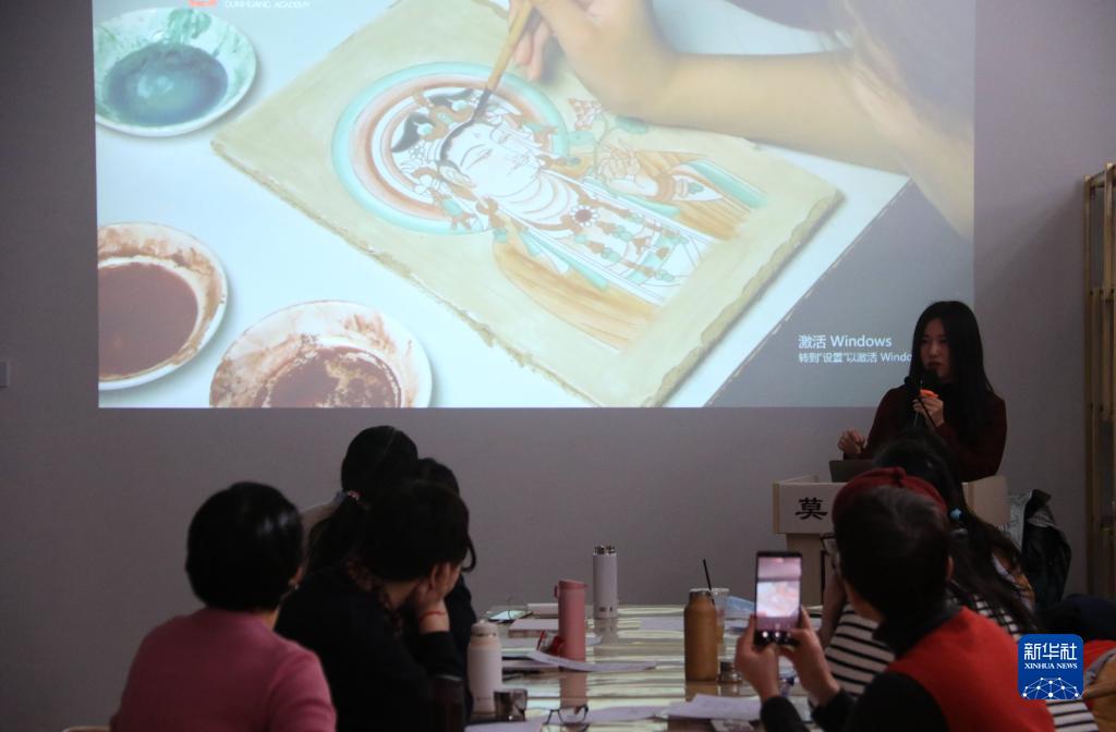 2月23日,在敦煌研究院莫高學堂,研學導師給學員講授敦煌壁畫臨摹技法。