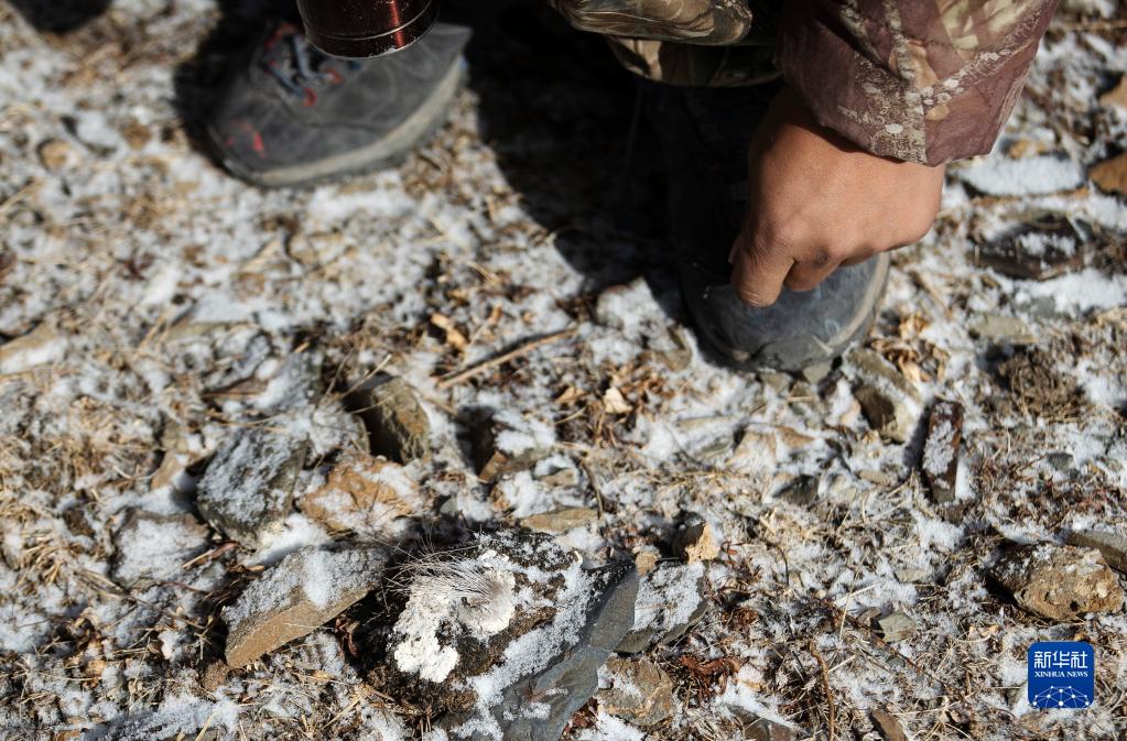 2月21日,更求曲朋在昂賽大峽谷里巡護時查看巖羊留下的毛發。