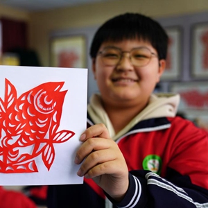 2月24日,河北邢臺經濟開發區景家屯小學學生展示自己的刻紙作品。