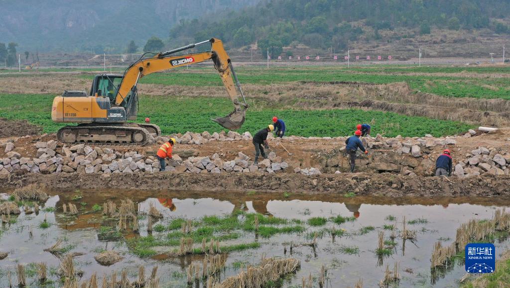 2月24日,施工人員在浙江省臺(tái)州市仙居縣雙廟鄉(xiāng)農(nóng)田修建灌溉水渠和硬化機(jī)耕道路(無(wú)人機(jī)照片)。