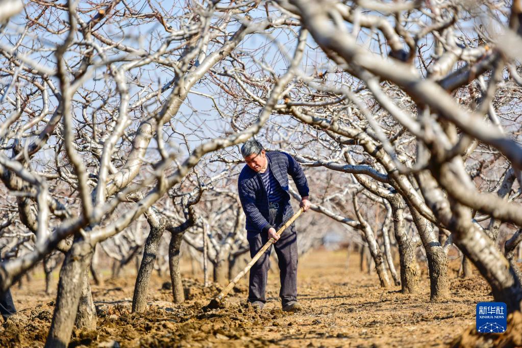 2月25日,農民在山東省青州市云門山街道付家村一處桃園里勞作。