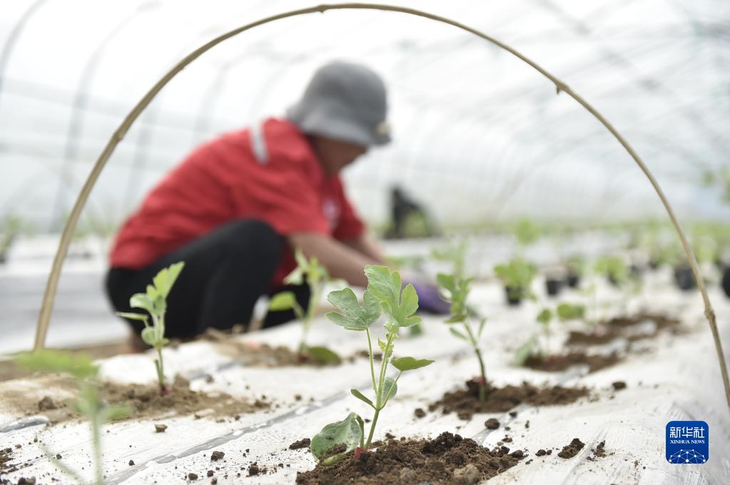 2月24日,河南省沁陽市西向鎮捏掌村,農民在栽種西瓜秧苗。