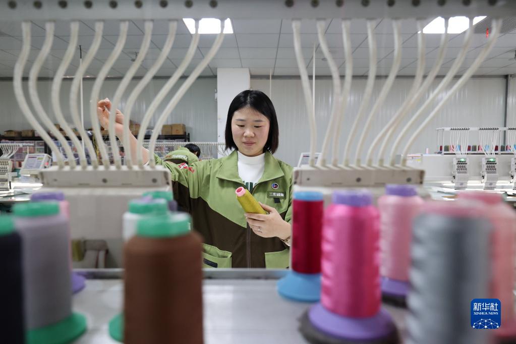2月25日,工人在浙江省湖州市德清縣新安鎮一家紡織企業生產車間內忙碌。