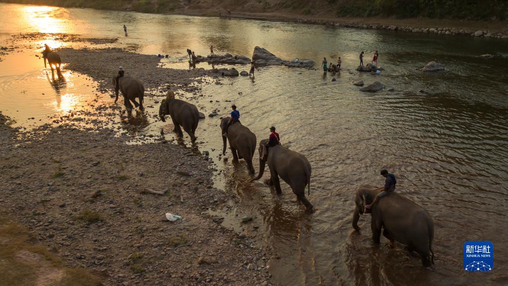 這是2月18日在老撾沙耶武里航拍的大象穿過河流。