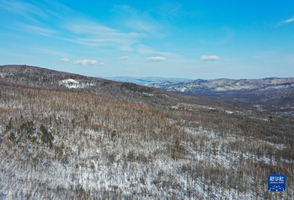 2月23日拍攝的內蒙古森工集團滿歸森工公司烏龍岱林場景色(無人機照片)。