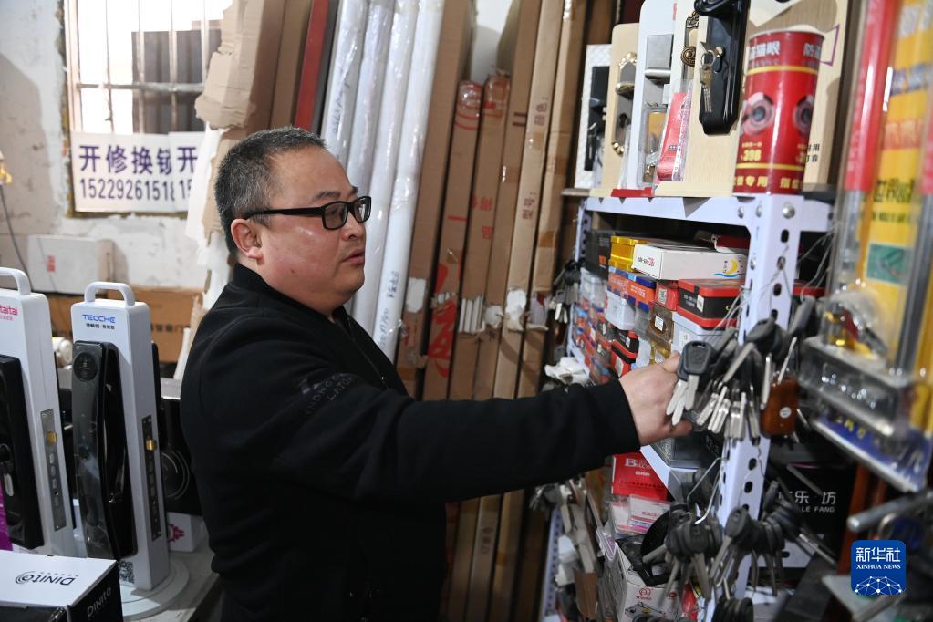 2月23日,在西安市灞橋區,殘疾人鎖匠蘇小泉整理貨架上的鎖具。