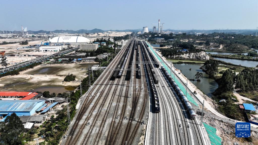 2月25日,西部陸海新通道鐵海聯(lián)運(yùn)班列在廣西欽州港站中轉(zhuǎn)(無(wú)人機(jī)照片)。