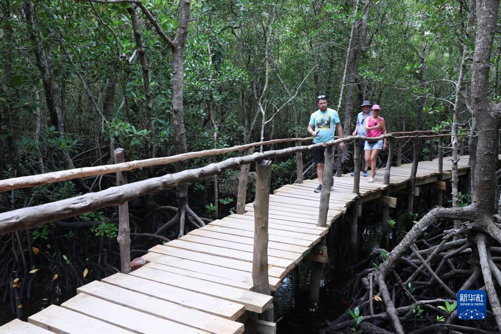 2月24日,游客在坦桑尼亞桑給巴爾島上的紅樹(shù)林里游覽。