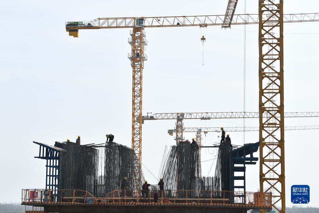 2月24日,中鐵十八局工人在位于西安市周至縣的陜西引漢濟渭工程渭河管橋施工現場工作。