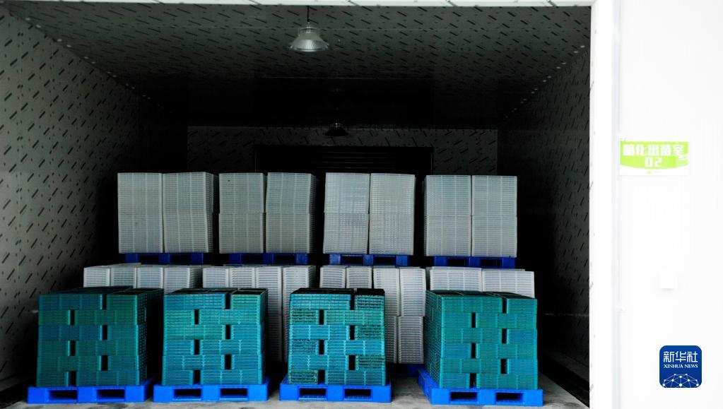 2月24日,在涇口鄉工廠化智能育秧中心,大批育秧秧盤已轉運至出苗室內進行育秧。