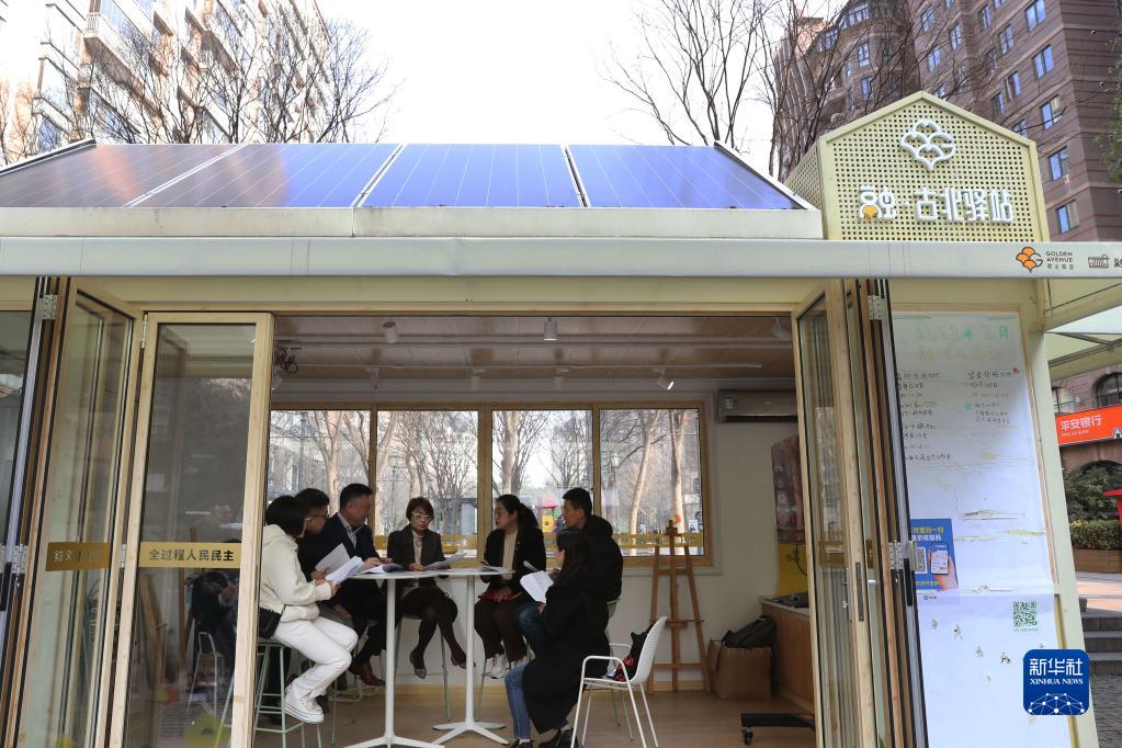 2月17日,在上海虹橋街道“融·古北驛站”,盛弘(右三)向轄區內的商戶宣傳普及新施行的《上海市住房租賃條例》。新華社記者 劉穎 攝