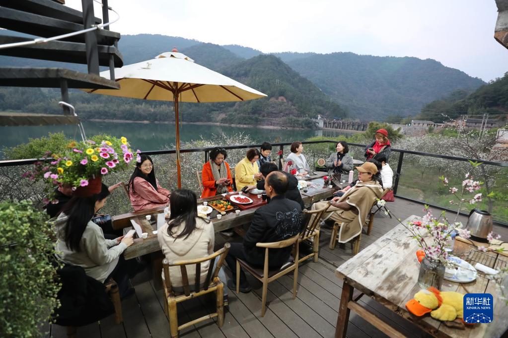 福州市永泰縣嵩口鎮(zhèn)大喜村游客在李花環(huán)繞的觀景臺(tái)上聊天(2月24日攝)。