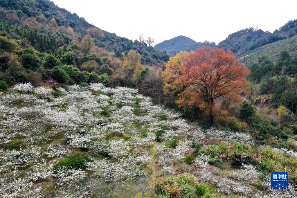 福州市永泰縣嵩口鎮(zhèn)大喜村山坡上李花盛開,春意盎然(2月24日攝,無人機(jī)照片)。
