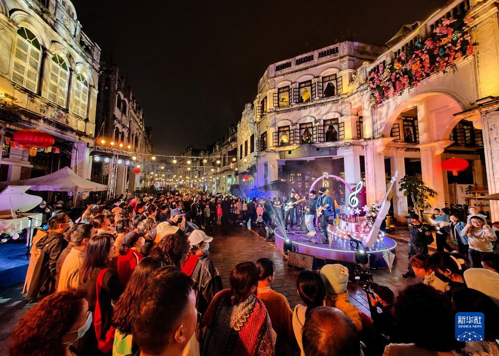 游客在海口騎樓老街的中西合璧市集觀看樂隊演出(2月3日攝)。