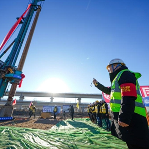2月25日,中鐵電氣化局的施工人員在雄忻高鐵新蓋房特大橋建設現(xiàn)場指揮鉆孔作業(yè)。