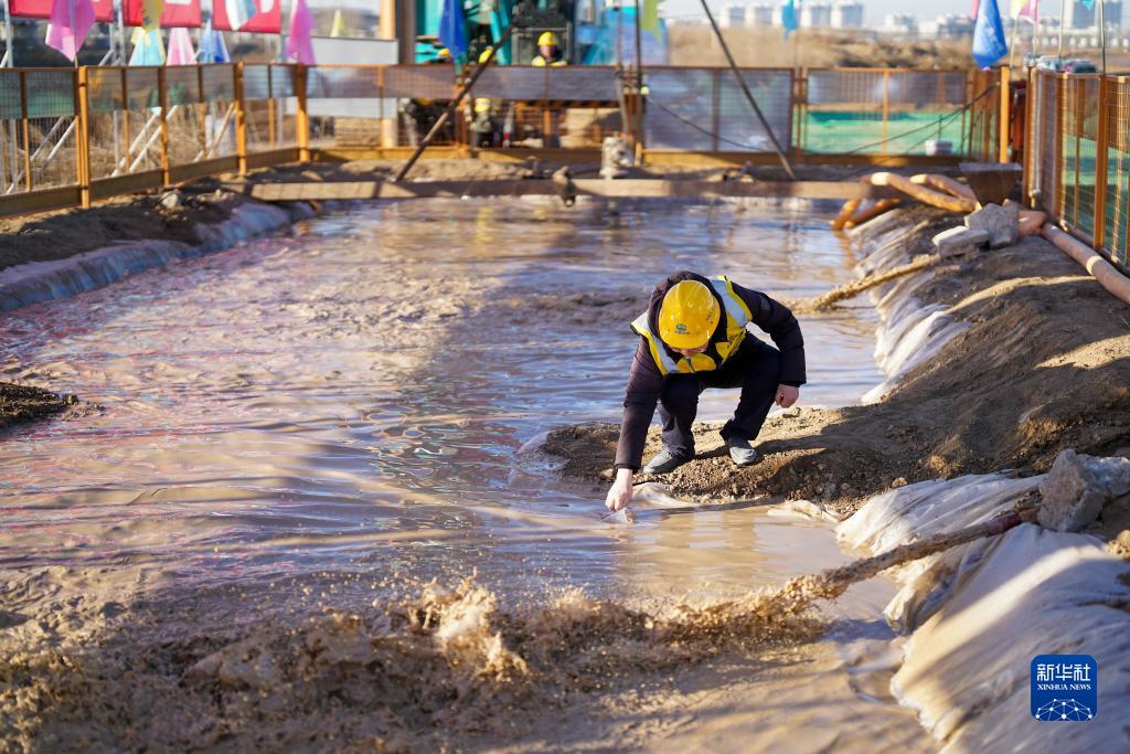 2月25日,中鐵電氣化局的施工人員在雄忻高鐵新蓋房特大橋建設(shè)現(xiàn)場對鉆孔泥漿進(jìn)行取樣。