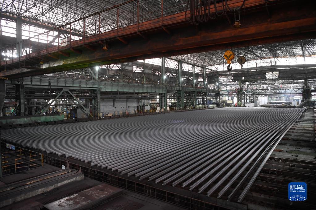 攀鋼釩軌梁廠內剛剛軋制成型的百米鋼軌在進行預彎冷卻(2月24日攝)。