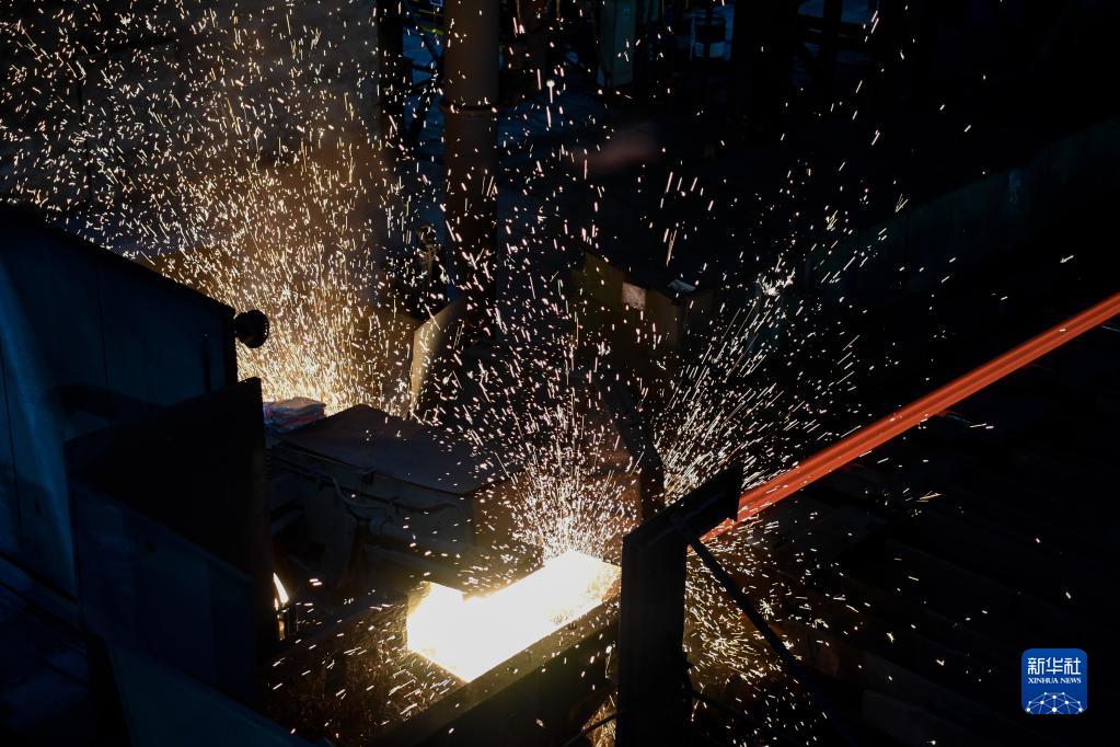 在攀鋼釩軌梁廠鋼軌生產線上,軋制后的鋼軌經冷床熱鋸鋸切(2月24日攝)。
