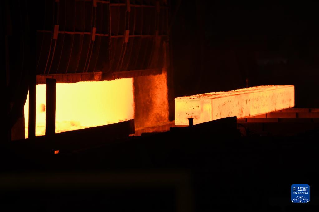在攀鋼釩軌梁廠鋼軌生產線上,鋼坯經加熱后出爐(2月24日攝)。