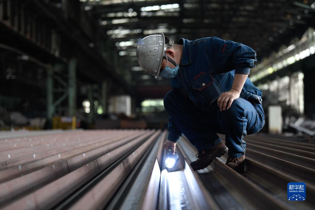 在攀鋼釩軌梁廠,工人對軋制成型的百米鋼軌進行表面檢測(2月24日攝)。