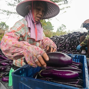 農(nóng)戶在海南省屯昌縣坡心鎮(zhèn)一處農(nóng)田邊分揀、打包采收的茄子(2月14日攝)。