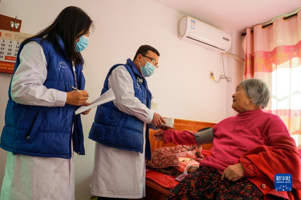 2月25日,威海市文登區澤頭鎮衛生院志愿者為徐原初老人定期檢查身體。