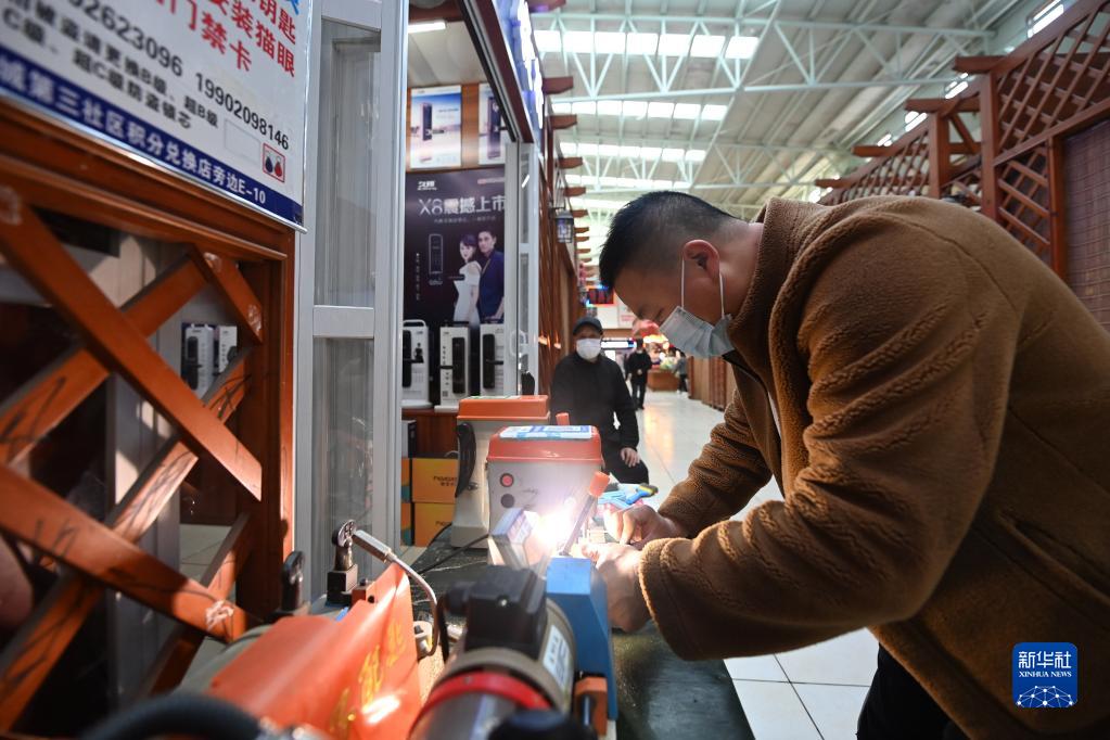 在中新天津生態城第三社區中心,一家開鎖行經營者正在為顧客配鑰匙(2月24日攝)。