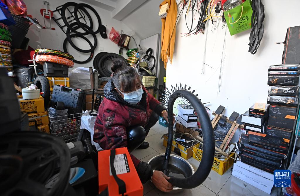 在中新天津生態(tài)城第三社區(qū)中心,一家自行車修理店經營者正在為顧客檢查輪胎(2月24日攝)。