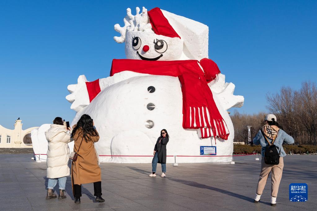 2月25日,游客在哈爾濱太陽島雪博會入口的雪塑前拍照。