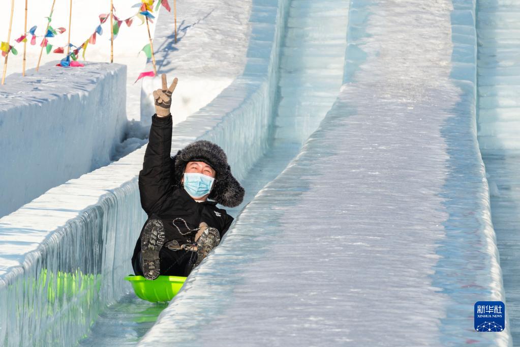 2月25日,游客在哈爾濱太陽島雪博會園區游玩。