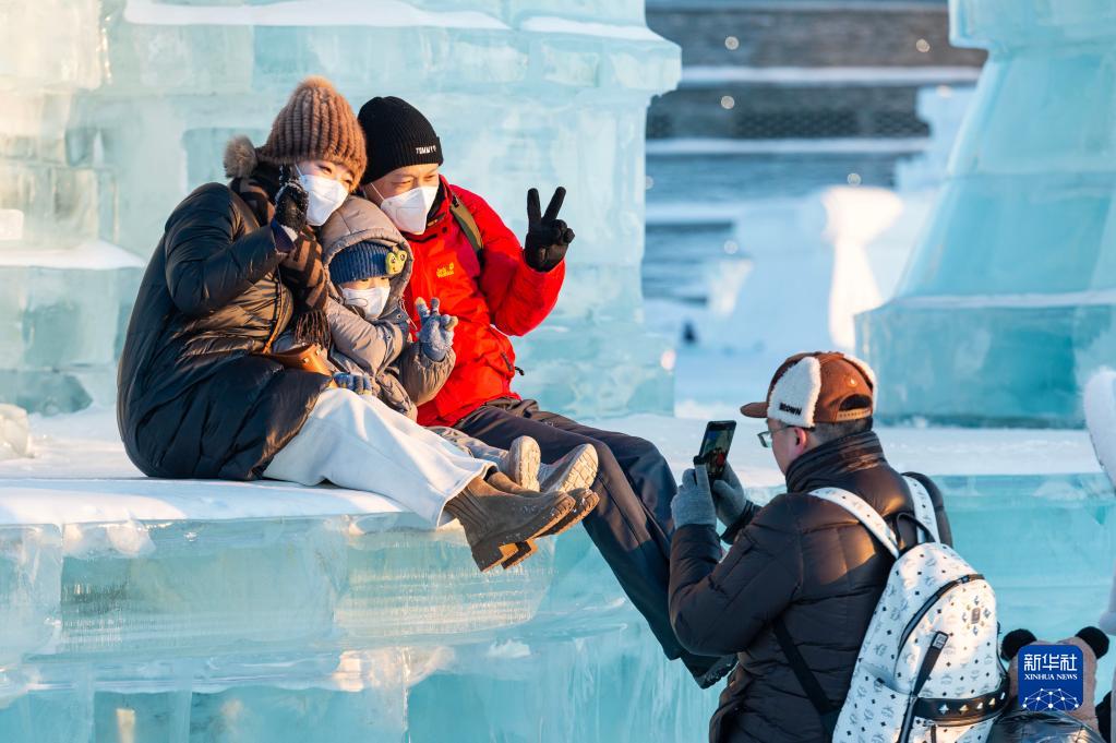 2月25日,游客在哈爾濱冰雪大世界園區留影。