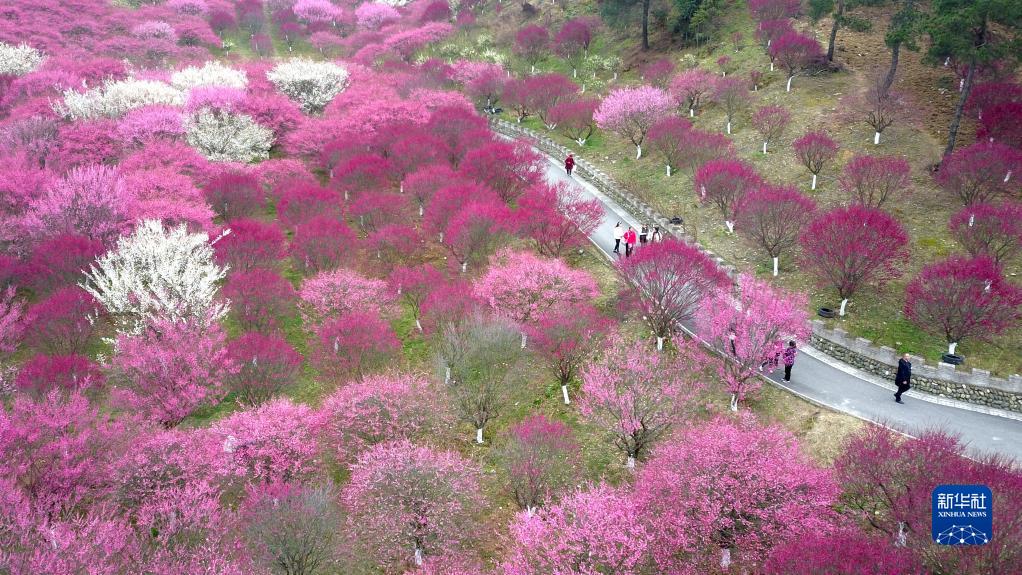2月25日,游人在湖北省十堰市茅箭區秦巴生態植物園賞花游玩(無人機照片)。