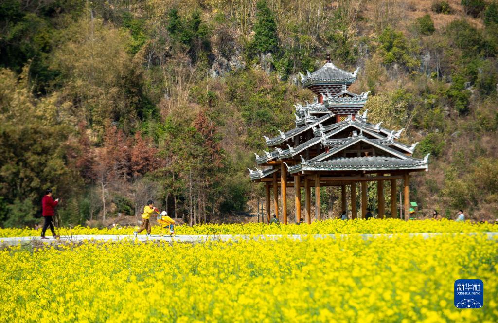 2月25日,人們?cè)谫F州省黔東南苗族侗族自治州從江縣洛香鎮(zhèn)上皮林村油菜花田間賞花游玩。
