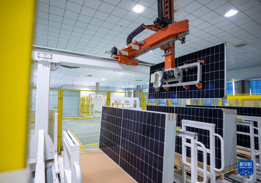 在位于寧夏同心工業(yè)園區(qū)清潔能源產(chǎn)業(yè)園的英利新能源(寧夏)有限公司組件制造部生產(chǎn)車間內(nèi),自動(dòng)化設(shè)備對(duì)光伏產(chǎn)品進(jìn)行分檔(2月23日攝)。