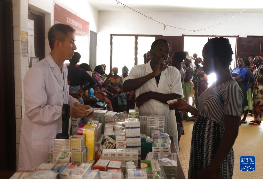 2月25日,在多哥卡拉市皮亞區醫療中心,中國第25批援多哥醫療隊醫生為當地病人發放藥品。