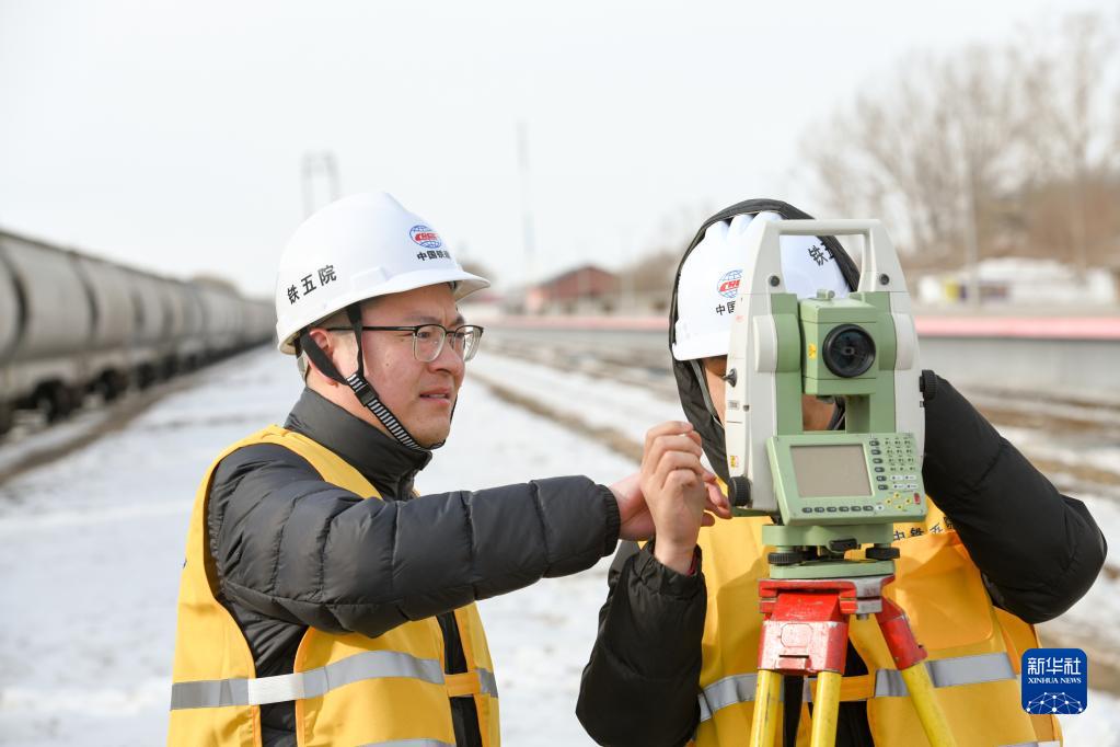 2月25日,黃騰(左)與同事在富錦火車站進行勘察測量作業。